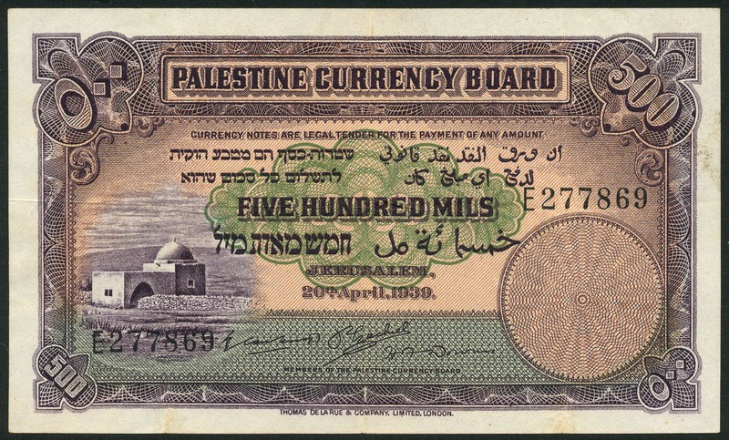 (x) Palestine Currency Board, 500 mils, 20 April 1939, serial number E277869, purple, green and pale orange, Rachel's Tomb on the West Bank, reverse purple, Tower of David at centre