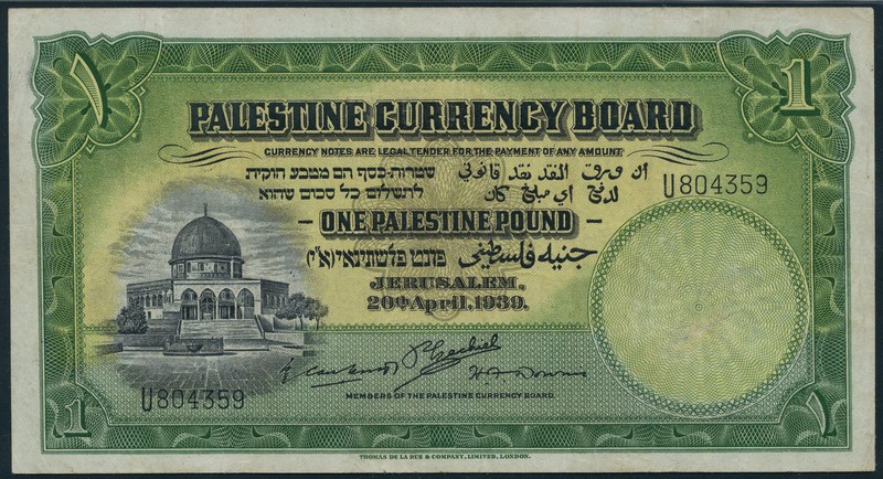 (x) Palestine Currency Board, £1, 20 April 1939, serial number U 804359, green and pale yellow, The Dome on the Rock, Jerusalem at left, value in lilac guilloche at centre, value at each corner, three printed signatures of the Members of the Palestine Currency Board, Sir John Caulcutt, Sir Percy Ezchiel and H.F. Downie at low centre, reverse green, the Citadel of Jerusalem with the Tower of David at centre, value at left and right and low centre