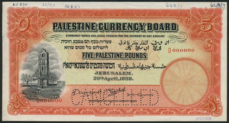 (†) Palestine Currency Board, specimen £5, 20 April 1939, red serial number D 000000, no signatures, scarlet and black on pale green underprint, Crusader's Tower at Ramleh at left, reverse the Citadel of Jerusalem and the Tower of David, perforated CANCELLED