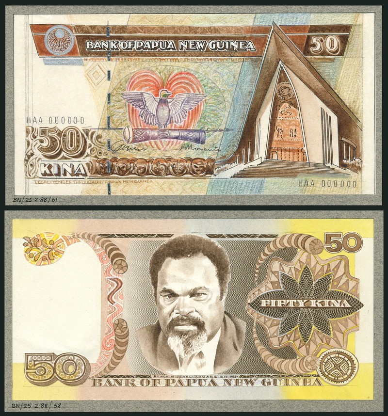 (†) Bank of Papua New Guinea, an obverse and reverse composite essay on board for a 50 Kina, ND, serial number HAA 000000, brown on multicoloured underprint, stylised Bird of Paradise at centre, National Parliament building at right, reverse Rt. Hon. Michael Somare, C.H., M.P. at centre, value at lower left and upper right,