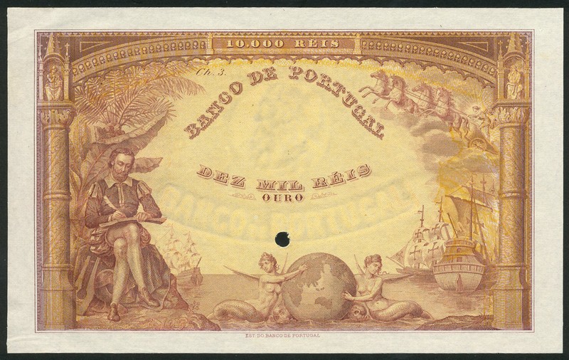 (†) Banco de Portugal, specimen 10 Mil Reis, ND (1902-09), no serial numbers, no signatures, brown on yellow underprint, Luis de Camoes seated at left, two mermaids and globe at lower centre, ships at right, reverse Prince Henry the Navigator at upper left, value in guilloche at upper right, arms at lower centre, one punch hole