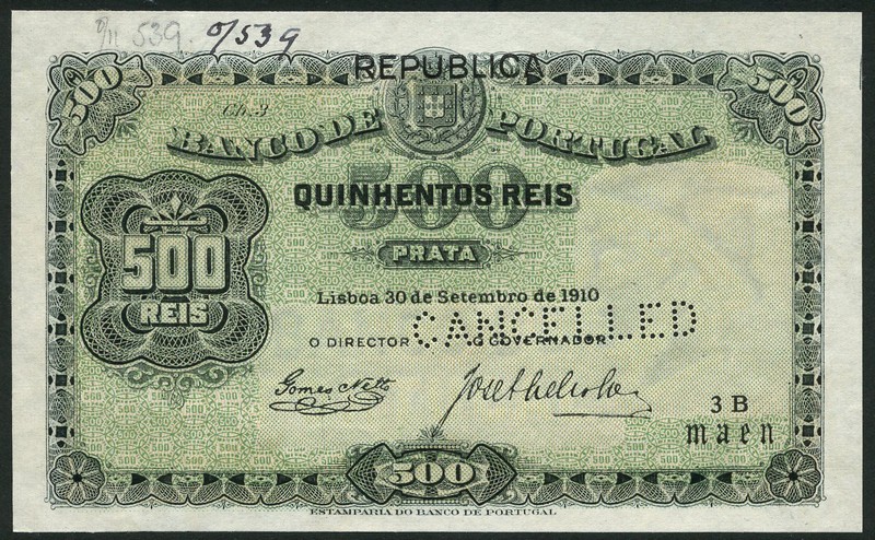(†) Banco de Portugal, specimen 500 Reis (2), 30 September 1910, no serial numbers, different signature combinations, black on green underprint, arms at upper centre, value in guilloche at left, black overprint REPUBLICA, reverse Mercury at right, value at upper centre, perforated CANCELLED