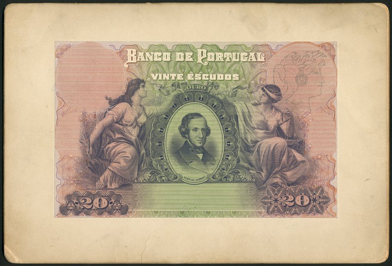 (†) Banco de Portugal, an obverse composite essay on board for a 20 Escudos, ND (1913), brown-lilac and green, portrait of Almeida Garrett at centre, woman with quill pen at left, woman holding scales of justice at right, value at lower left and right, sketch of head of Minerva in watermark area at top right