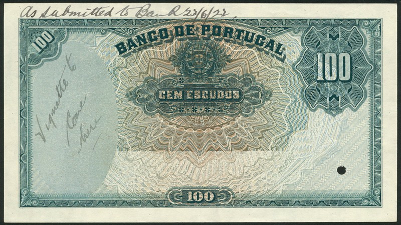 (†) Banco de Portugal, specimen proof for an unissued 100 Escudos, ND (ca1922), green on multicoloured underprint, arms and value at upper centre, value in guilloche at upper right, space for vignette at left, reverse brown and purple on blue, yellow and green underprint, liner at right, value at upper left and right, one punch hole