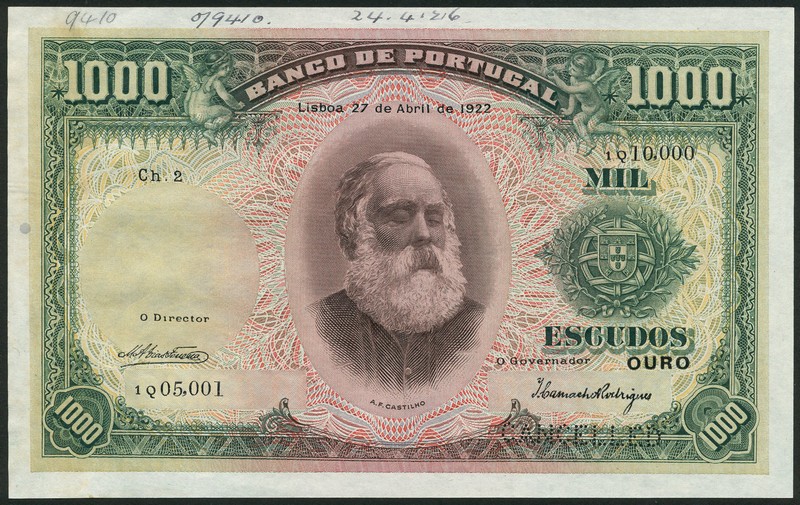 (†) Banco de Portugal, printer's archival specimen colour trial 1000 Escudos, 27 April 1922, serial run 1Q 05,001 to 1 Q 10,000, brownish-purple and green on multicoloured underprint, portrait of A. F. Castilho at centre, arms at right, cherubs at top left and right, reverse pink and blue-green on multicoloured underprint, two allegorical women with lyre and torch at centre, perforated CANCELLED