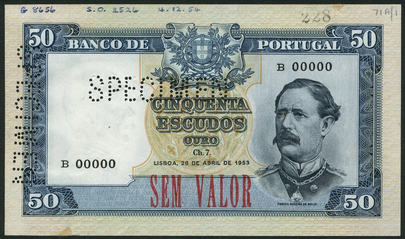 (†) Banco de Portugal, specimen 50 Escudos (2), 28 April 1953, chapa 7, serial number B 0000, blue on multicoloured underprint, Fontes Pereira de Melo at right, arms at upper centre, reverse statue 'O Pensador' at centre, overprinted SEM VALOR in red on obverse and reverse, perforated SPECIMEN