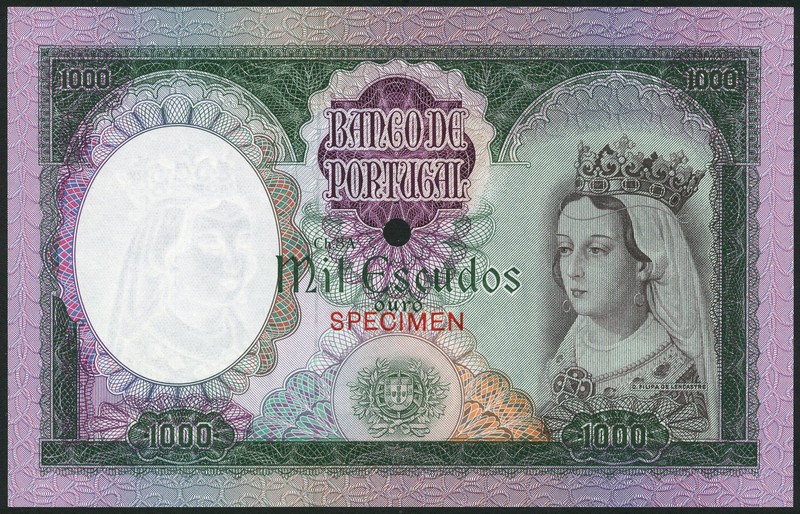 (†) Banco de Portugal, specimen colour trial 1000 Escudos, ND (1961), chapa 8A, no serial numbers, brown and purple on multicoloured underprint, Queen Philippa at right, arms at lower centre, reverse green, queen and two men at centre left, overprinted SPECIMEN in red on obverse and reverse, one punch hole