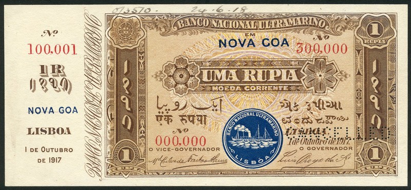 (†) Banco Nacional Ultramarino, Portuguese India printer's archival specimen 1 Rupia with counterfoil, Lisbon, 1 October 1917, serial number run 000,000 to 300,000, brown on tan underprint, blue steamship Type II at lower centre, arms at top left, value in three corners, black overprint NOVA GOA at upper centre, reverse red on pale green and grey underprint, woman looking at ships, perforated CANCELLED