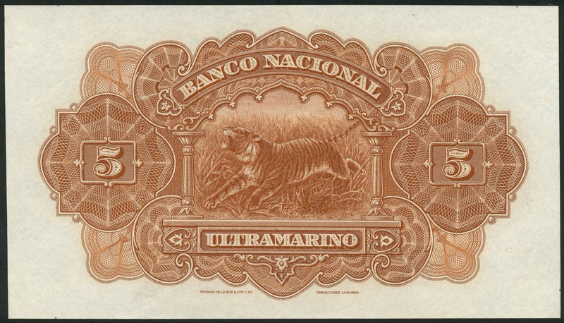 (†) Banco Nacional Ultramarino, Portuguese India reverse specimen colour trial proof 5 Rupias, ND (1924-38), red-brown, tiger at centre, value in ornate guilloches at left and right,