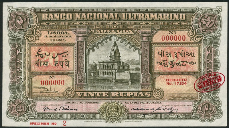 (†) Banco Nacional Ultramarino, Portuguese India specimen 20 Rupias, 11 January 1938, serial number 000000, Nova Goa, olive-brown on peach underprint, palace at centre, value in each corner, reverse tiger at centre, value in ornate guilloches at left and right, overprinted in red with one De La Rue specimen oval on obverse