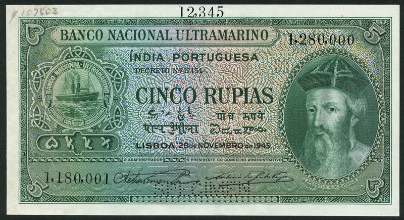 (†) Banco Nacional Ultramarino, Portuguese India printer's archival specimen 5 Rupias, 29 November 1945, serial number run 1,180,001 to 1,280,000, India Portuguesa, green on blue and brown underprint, Afonso de Albuquerque at right, value in each corner, steamship seal at left, reverse young woman looking at ships, value in ornate guilloche at lower right, perforated SPECIMEN