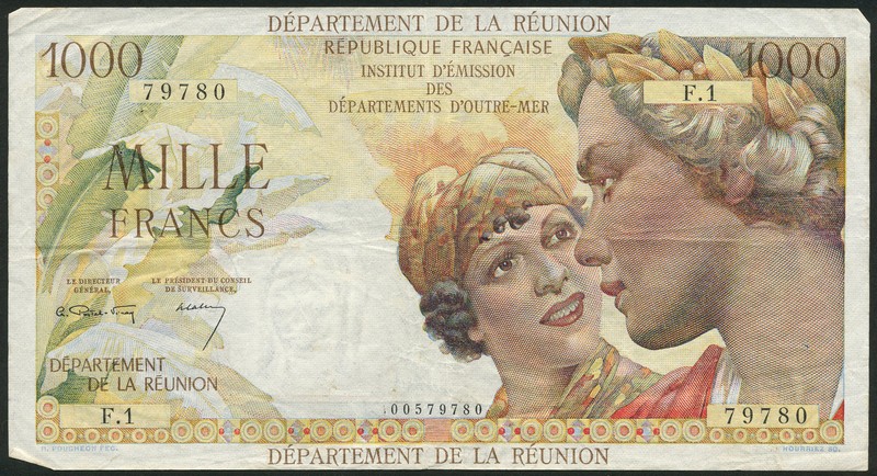 Institut D'Emission des Departements d'Outre-Mer, Reunion, 1000 francs, ND (1964), serial number F.1 79780, multicoloured, two women at right, Postel-Vinay and Calvet signatures, reverse multicoloured, woman and canoe