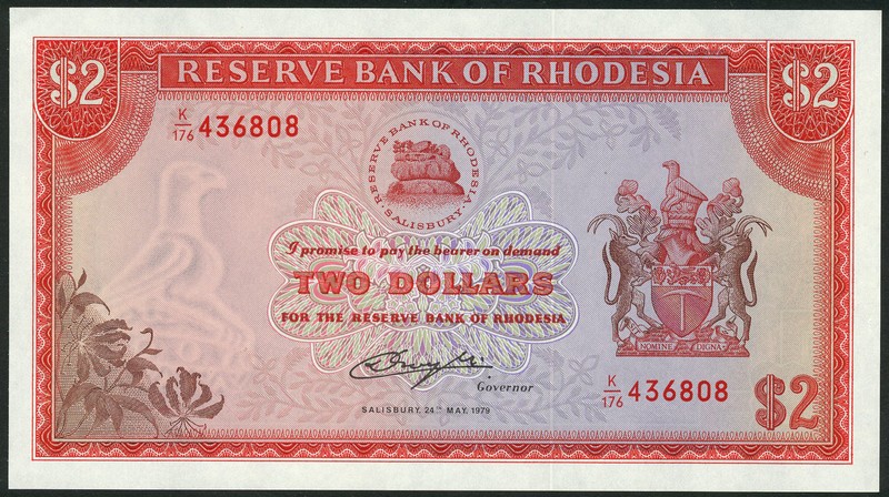Reserve Bank of Rhodesia, $1, 2 August 1979, serial number W/1 044971, blue on multicolour underprint, arms at right, $2 (4), 24 May 1974, prefix K/176, two consecutive serial numbers, red on multicolour underprint, arms at left