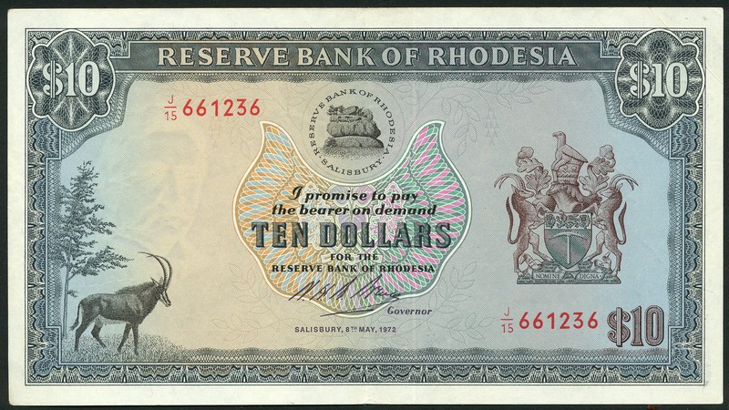 Reserve Bank of Rhodesia, $1 (2), 18 April 1978, prefixes L/101, L/111, blue on multicolour underprint, arms at right, $2, 29 June 1973, serial number K/74 742457, red on multicolour underprint, arms at left, $5 (2), 20 October 1978, prefixes M/18, M/19, brown on multicolour underprint, $10, 8 May 1972, serial number J/15 661236, blue on multicolour underprint