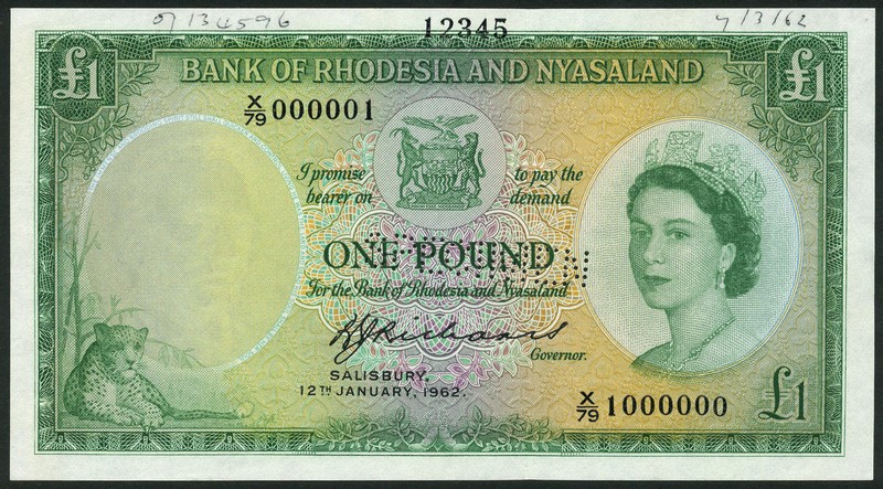 (†) Bank of Rhodesia and Nyasaland, printers archival specimen £1, 12 January 1962, serial numbers X/79 000001-X/79 1000000, green on multicolour underprint, Elizabeth II at right, leopard at low left, arms at top centre, reverse green, Great Zimbabwe Ruins at centre, perforated SPECIMEN, ink annotations in top margin