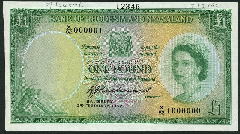 (†) Bank of Rhodesia and Nyasaland, printers archival specimen £1, 2 February 1962, serial numbers X/82 000001-X/82 1000000, green on multicolour underprint, Elizabeth II at right, leopard at low left, arms at top centre, reverse green, Great Zimbabwe Ruins at centre, perforated SPECIMEN, ink annotations in top margin