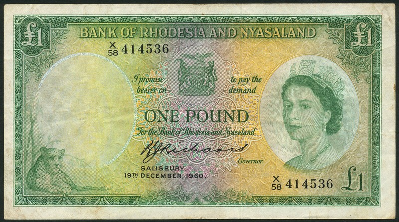 Bank of Rhodesia and Nyasaland, £1, 19 December 1960, 11 March 1960, prefixes X/58, X/39, green on multicolour underprint, values at top left, top right, bottom right, Elizabeth II at right, signature of Graffety-Smith and Richards respectively at centre, Zimbabwe ruins on reverse, Cecil Rhodes watermark