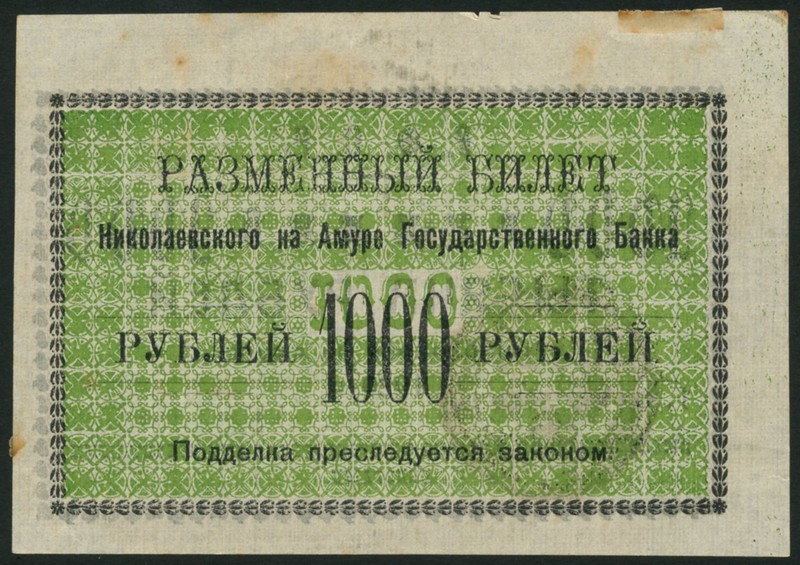 Nikolaevsk-on-Amur Branch Government Bank, Russia, 250 rubles (3), 1000 rubles (3), 1920, first black and red-brown, second black and green, black handstamp at low left