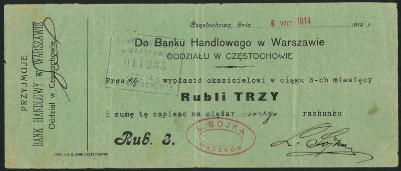 Czestochowa Commerce Bank, Russia, 1, 3 and 5 rubles, 1914-15, black on blue, pink and green and pink paper respectively, hand stamped dates and manuscript signatures