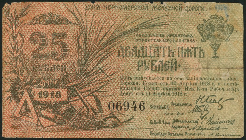 Black Sea Railroad, Russia, 3 rubles, 1918, serial number 13880, 5 rubles, 1918, serial number 01309 and 25 rubles, 1918, serial number 06946, values and symbols of industry and labour at left and right