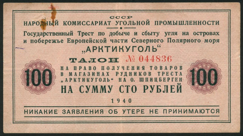(x) Spitzbergen Coal Mine, Russian Administration, 100 rubles, 1940, serial number 044836, black and red on red underprint, value at left and right, reverse red, value at centre