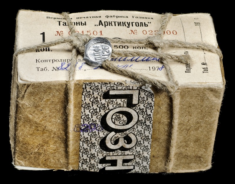 (x) Spitzbergen Coal Mine, Russian Administration, 1 kopek (500), 1978, serial numbers 021501-022000, brown on green underprint, value at left and right, complete five bundles of 100 notes, in their original packaging, including tape, string and metal seal