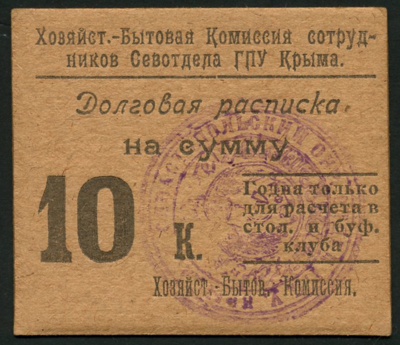 Sebastapol OGPU (KGB), Dolgovaya raspiska (debt note) for 10 kopeks, ND (1924 onwards), black on brown carton, value at left, purple handstamp on obverse