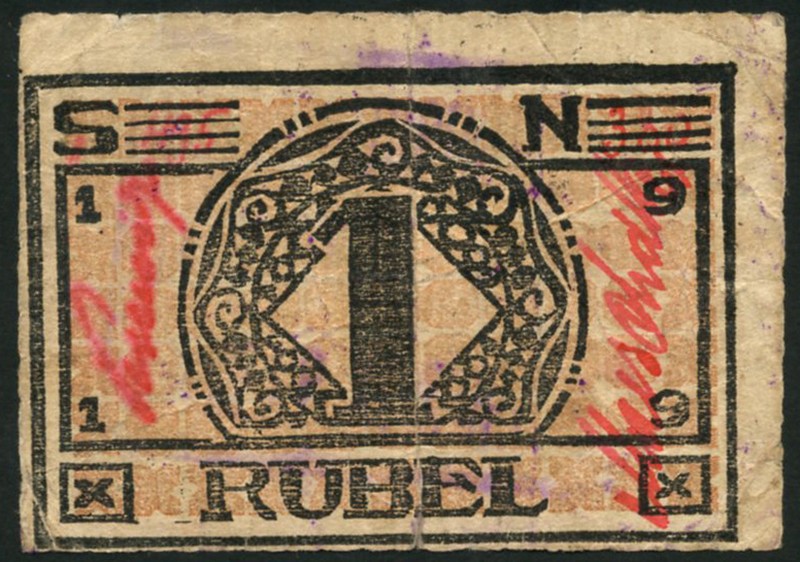 Krasnaya Ryetchka POW Camp, Russia, 50 kopeks and 1 ruble, 1919, black text on tan card, manuscript signatures at left and right, large blue handstamps on reverse