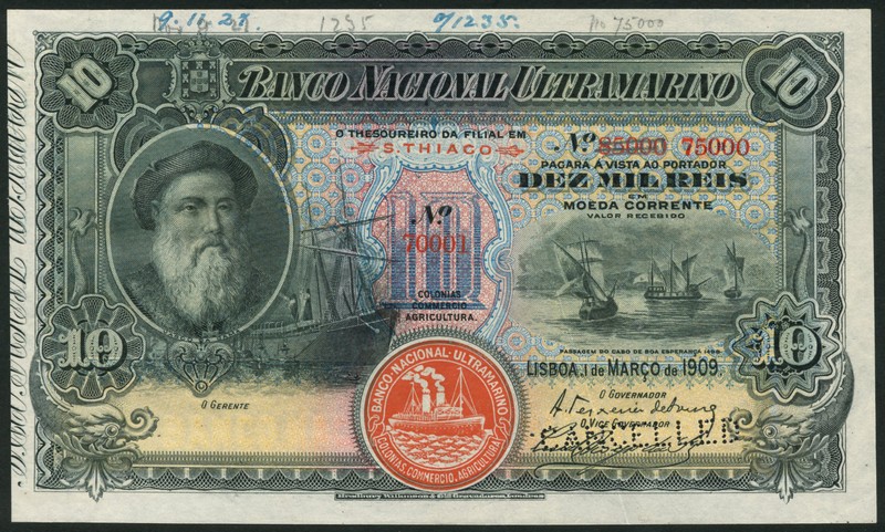 (†) Banco Nacional Ultramarino, St Thomas & Prince, printers archival specimen 10 mil reis, S.Thiaco, 1 March 1909, serial numbers 70001-75000, black on multicolour underprint, Vasco da Gama at left, ships at right and centre left, Steamship seal type III, serial number previously printed as 85000, and crossed out, so we can assume the print run was adjusted to 75000 later, perforated CANCELLED, ink annotations in top margin