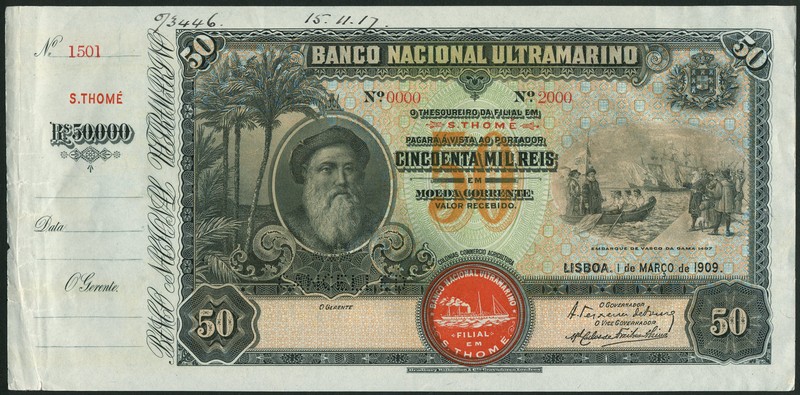 (†) Banco Nacional Ultramarino, St Thomas & Prince printer's archival specimen 50 Mil Reis, Lisbon, 1 March 1909, with counterfoil, serial number run 0000 to 2000, black and green on multicoloured underprint, portrait of Vasco da Gama at left, embarkation scene at right, steamship seal Type I, reverse green, blue, pink and yellow, woman, anchor and ships, perforated CANCELLED