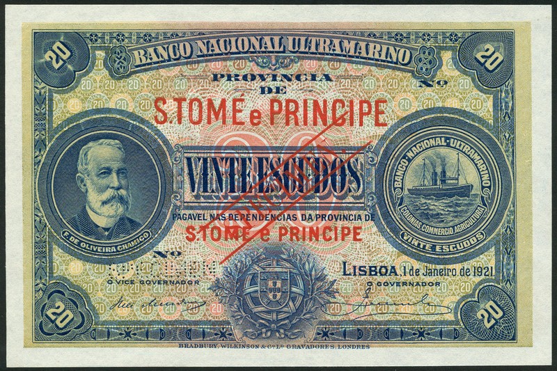 (†) Banco Nacional Ultramarino, St Thomas & Prince specimen 20 Escudos, Lisbon, 1 January 1921, no serial numbers, blue on multicoloured underprint, portrait of F. de Oliveira Chamico at left, steamship seal at right, reverse woman, anchor and ships, overprinted SPECIMEN in red on obverse