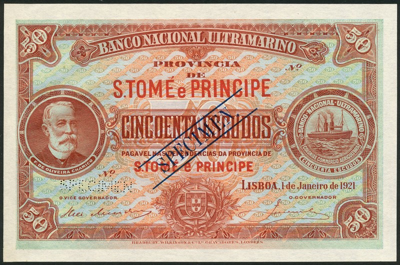 (†) Banco Nacional Ultramarino, St Thomas & Prince specimen 50 Escudos, Lisbon, 1 January 1921, no serial numbers, orange-brown on multicoloured underprint, portrait of F. de Oliveira Chamico at left, steamship seal at right, reverse woman, anchor and ships, overprinted SPECIMEN in black on obverse