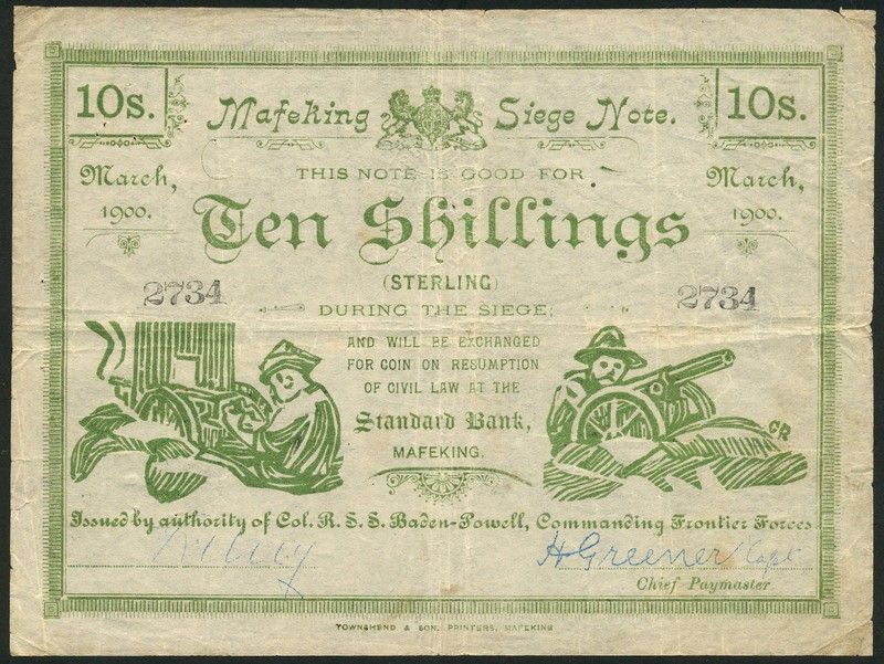 Mafeking siege note, 10 shillings, March 1900, serial number 2734, green and white, defender and siege gun at low left and right, 'Commanding' in text, Urry and Greener signatures