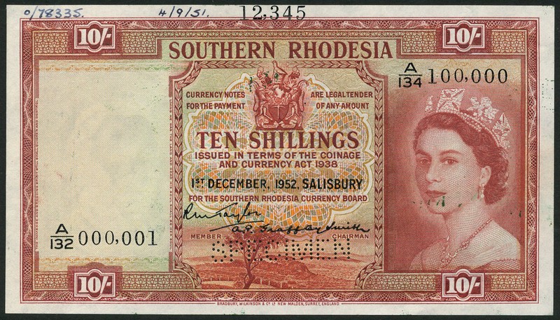 (†) Southern Rhodesia Currency Board, printers archival specimen 10/-, 1 December 1952, serial numbers A/134 000001-100000, also a specimen 10/-, 3 January 1953, prefix A/152, both red-brown on multicolour underprint, Elizabeth II at right, arms at top centre, value at each corner, first perforated SPECIMEN, second with two cancellation holes, ink annotations in top margin, second has APPROVED text on reverse, with manuscript signature