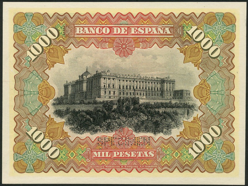 (†) El Banco de Espana, specimen reverse proof 500 Pesetas, ND (1907), grey-brown on pale yellow underprint, arms at centre, value at upper and lower centre set in ornate guilloches; also specimen reverse proof 1000 Pesetas, ND (1907), black, red, blue and ochre, Palacio Real de Madrid at centre, value in each corner, both perforated SPECIMEN