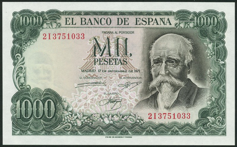 (x) Banco de Espana, 1000 pesetas (3), 17 September 1971 (1974), red prefixes 6C,7E,2I, dark green on green and pink underprint, Echegaray at right, value at each corner,