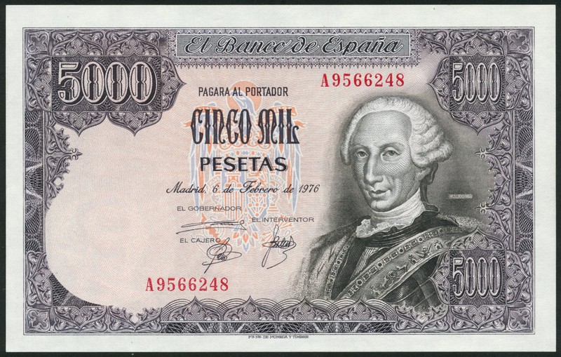 (x) Banco de Espana, 5000 pesetas, 6 February 1976, red serial number A9566248, violet and multicoloured, King Carlos III at right, values at top left, top right and bottom right,