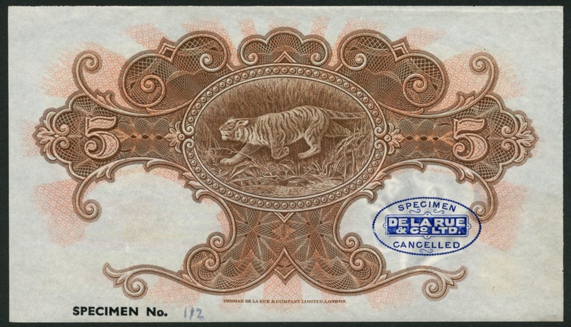 (†) Government of the Straits Settlements, specimen reverse colour trial 5 Dollars, ND (1925-30), brown on pink underprint, tiger at centre, value in ornate guilloches at left and right, overprinted SPECIMEN No. 112 in black with one blue De La Rue specimen oval