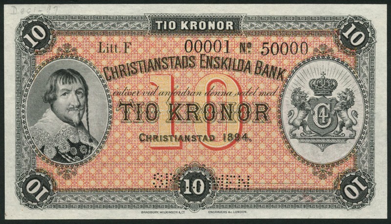 (†) Christianstads Enskilda Bank, printer's archival specimen 10 Kronor, 1894, Litt F, serial run 00001 to 50000, black on red and yellow underprint, King Christian IV at left, arms at right, reverse red and orange, helmeted female at centre