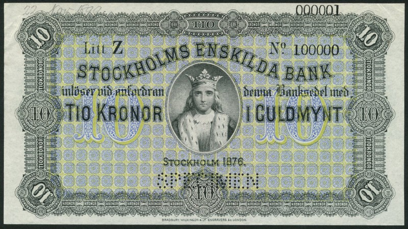 (†) Stockholms Enskilde Bank, printer's archival specimen 10 Kronor (2), 1876, Litt Y, serial run 000001 to 100000 and Litt Z 000001 to 100000, black on blue and yellow underprint, Saint Eric at centre, reverse green and red, female heads at left and right, value at centre, perforated SPECIMEN