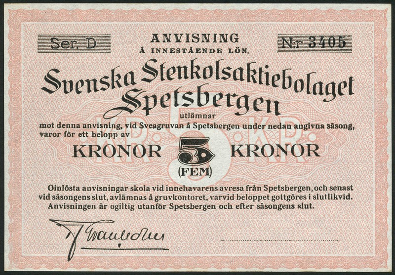 Swedish Spitsbergen, unissued 10 ore, serial number H7823, unissued 1 krona, serial number E4820, and unissued 5 kronor, serial number D3405, uniface, black on olive, tan and red underprints respectively, value at centre
