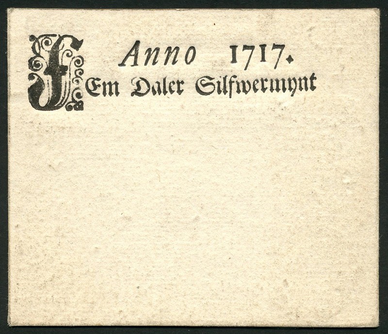 (x) Contribution Office and Purchasing Commission, Sweden, 5 daler silvermynt, unissued remainder, 1717, black, value at top centre, reverse with three embossed stamps at left