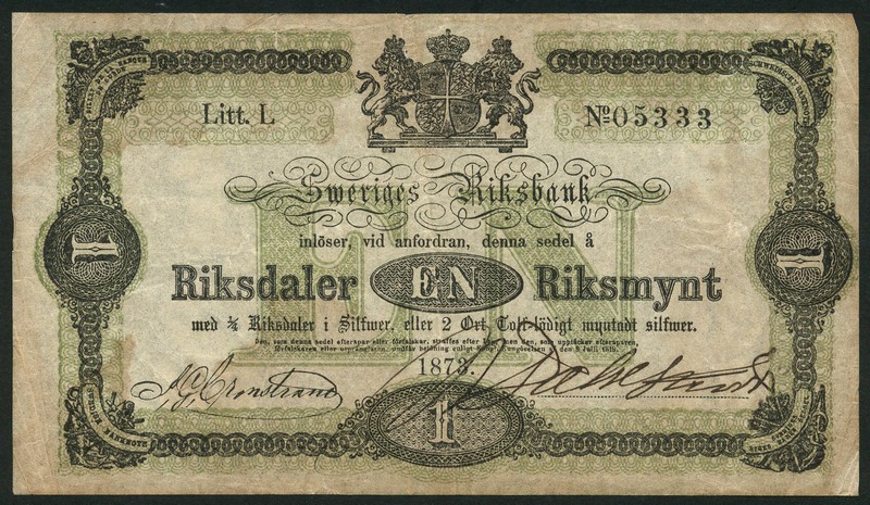 (x) Sveriges Riksbank, 1 riksdaler, 1873, serial number L 05333, black on green underprint, arms at top centre, value at low centre, and left and right, printed signature at left, manuscript signature at right