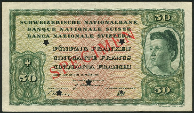 Swiss National Bank, specimen 50 francs, Bern und Zurich, 1 March 1945, no serial numbers, green and pale red, youmg maiden at right, value top right and low left and right, three printed signatures below, reverse green, man and bull at centre, mountains in background, value at each corner