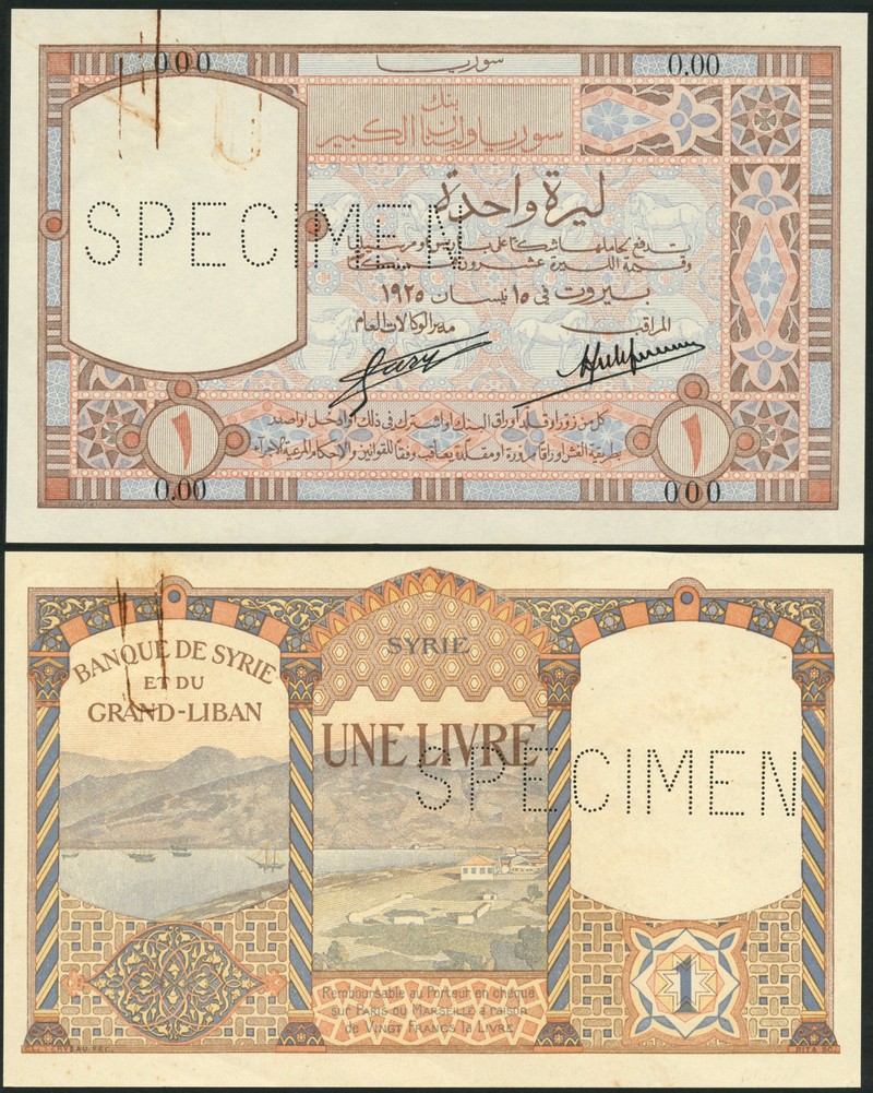 Banque de Syrie et du Grand-Liban, specimen obverse and reverse 1 livre, 1925, zero serial numbers, pale blue and brown, value low left and right, reverse blue and brown, pillars and coastline, blue SYRIE top centre