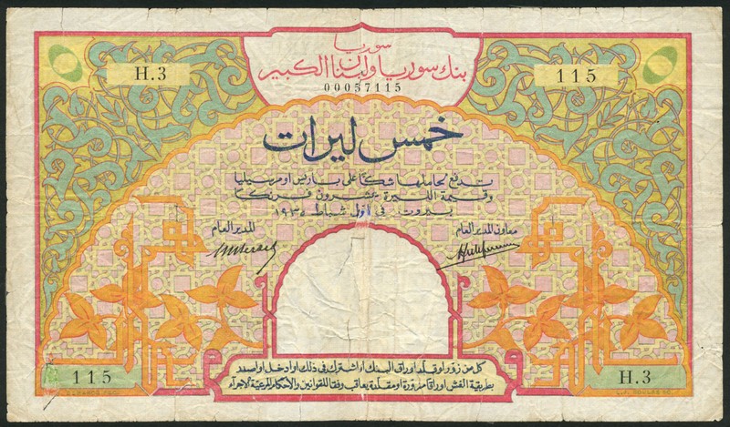 Banque de Syrie et du Liban, specimen 5 livres, 1 February 1935, black zero serial numbers H.3-115, red, green, orange and pink, ornate design, Berard and Laferriere signatures, reverse multicoloured, arched building at centre, SYRIE in red top centre, value at top left and right