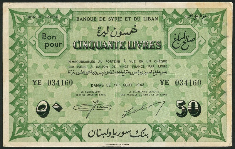 Banque de Syrie et du Liban, 50 livres, 1 August 1942, serial number YE 034160, black and green on light green underprint, value at low left and right, reverse green