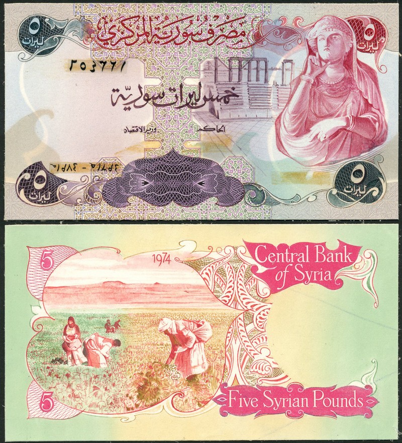 (†) Central Bank of Syria, a composite obverse and reverse essay on card for a 5 Pounds, 1974, serial number 254361, carmine-red, purple and green on multicoloured underprint, female statue at right, amphitheatre at centre right, reverse women harvesting crops