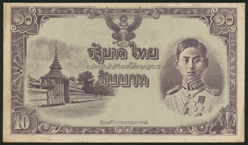 Government of Thailand, unissued 10 baht, ND (1942-44), purple on pale grey-blue underprint King Rama VIII, portal at left
