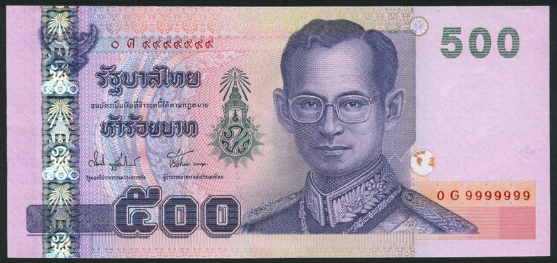 (x) Bank of Thailand, 500 baht, ND (2001), serial number 0G 9999999, violet and multicoloured, King Rama IX at right